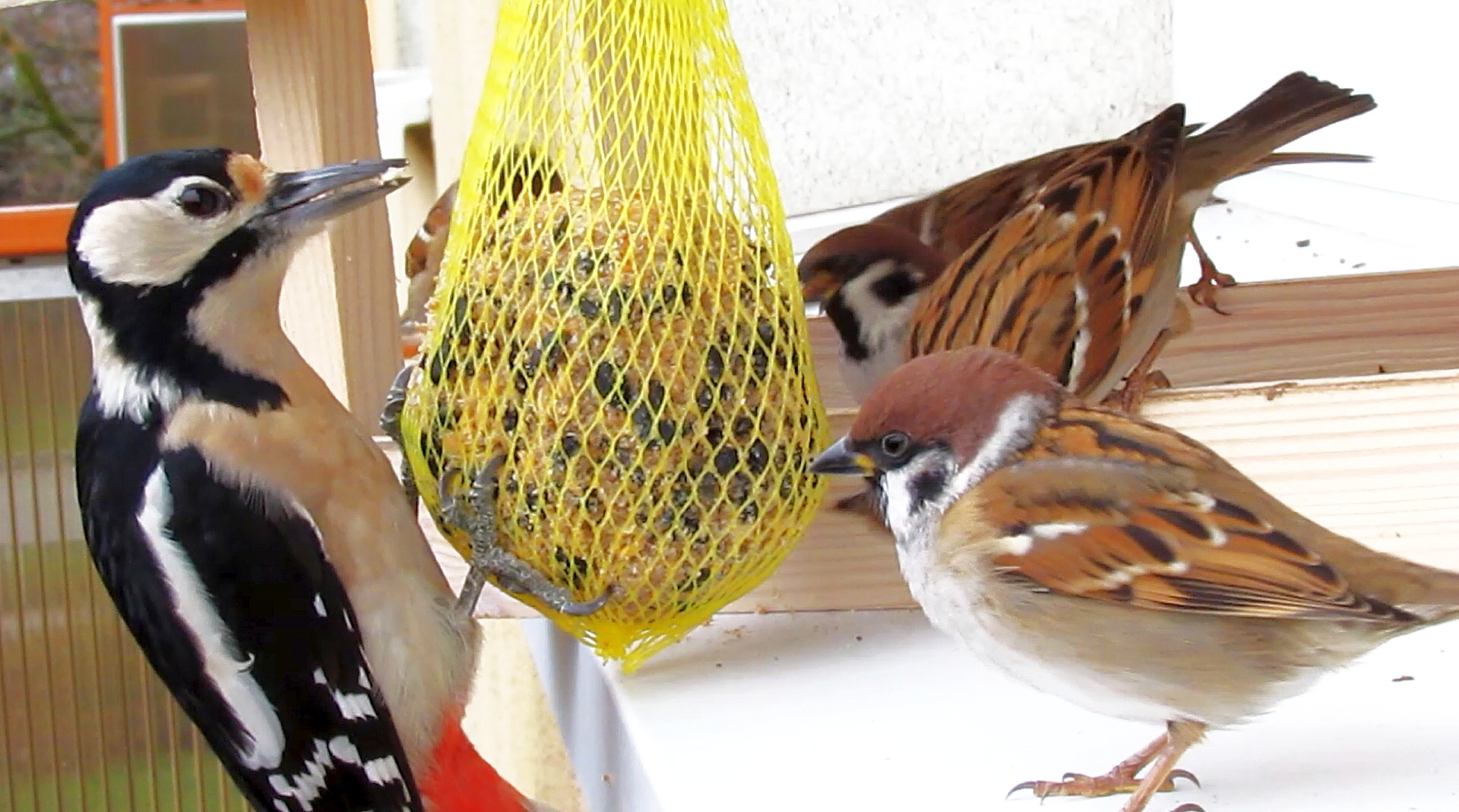 Strakapoud velký, samička, s vrabci polními, Přerov, 23. 11. 2014 video na: http://youtu.be/Gk6RiCE2F_s