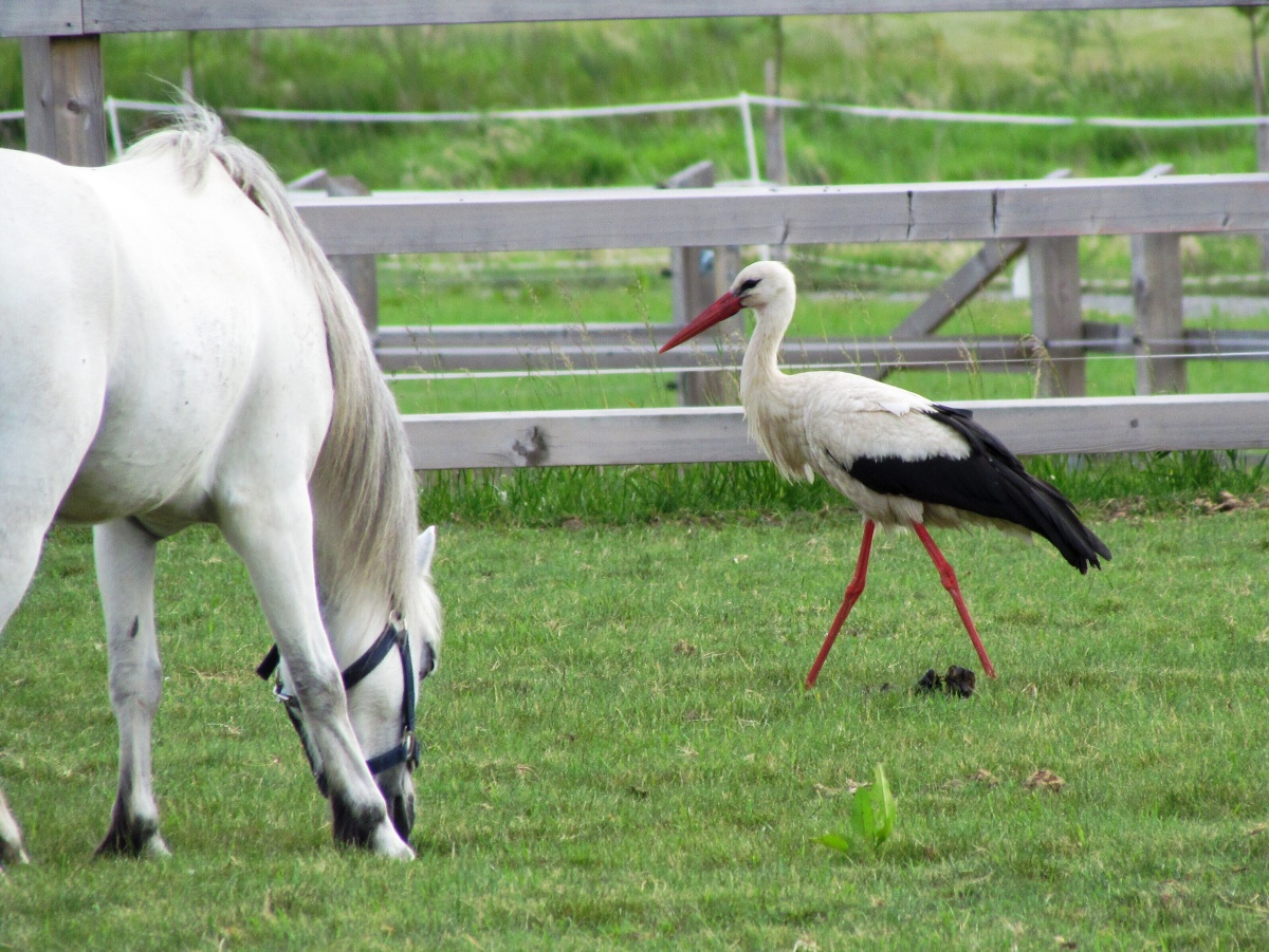 Čáp bílý ve výběhu koní na farmě Čapí hnízdo v Olbramovicích - červen 2012