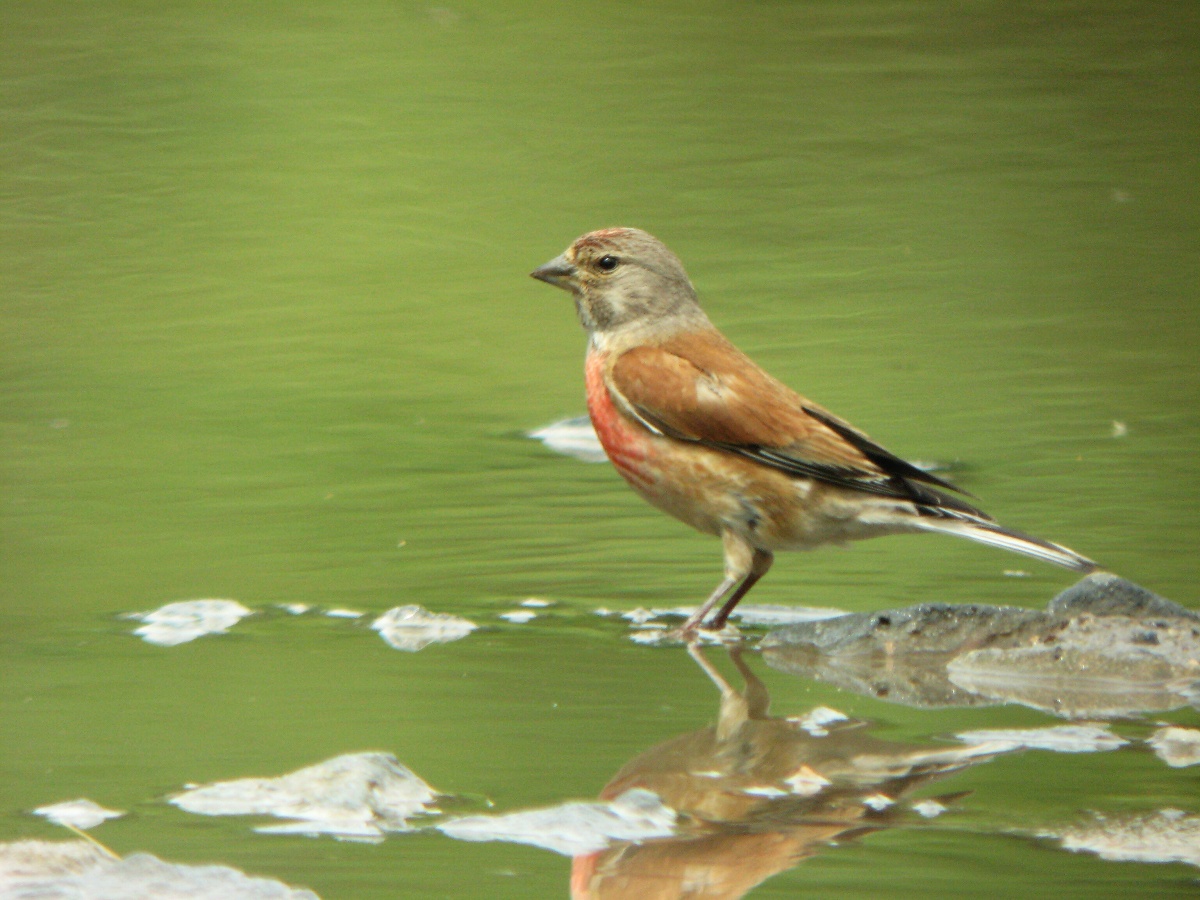 Koupající se samec konopky obecné v Přerově 21.6.2008 (digiscoping).